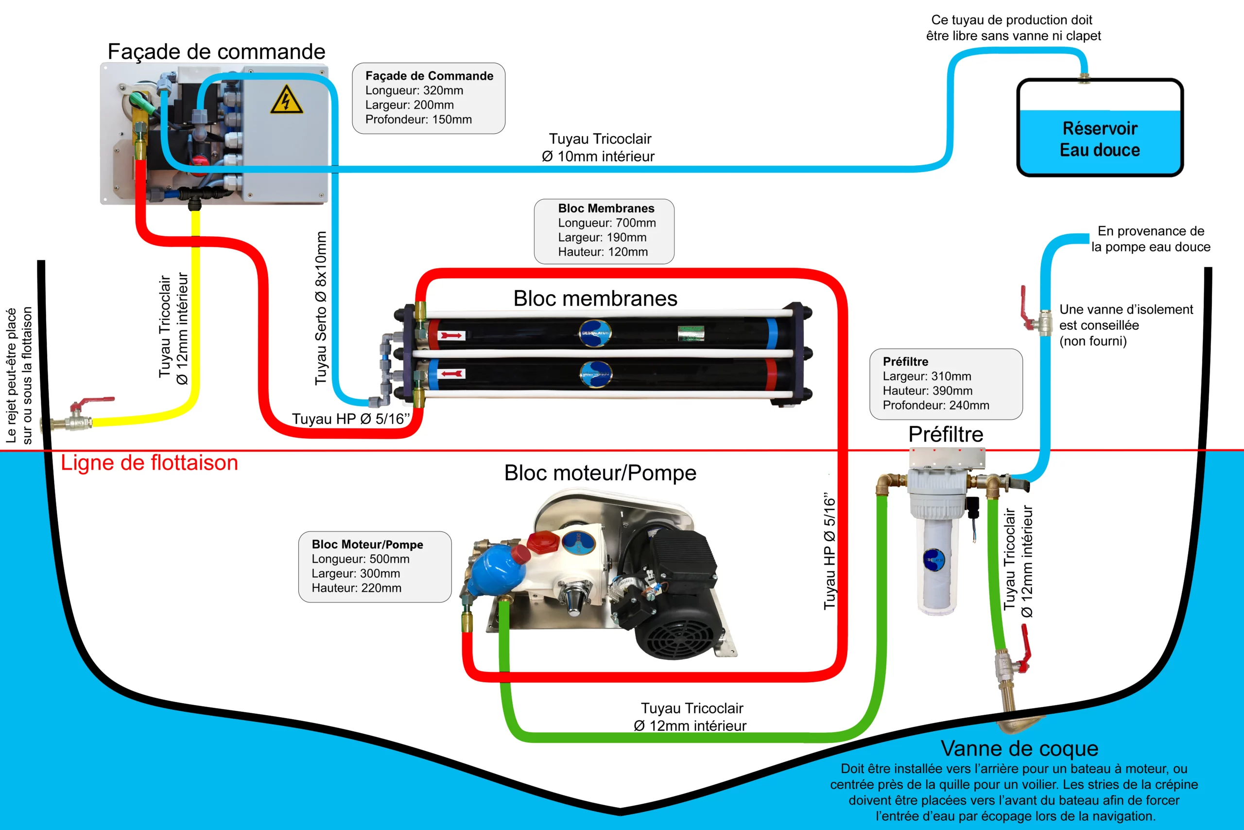 - Tuyauterie haute pression : 2 tubes et 4 raccords spéciaux DESSALATOR®.